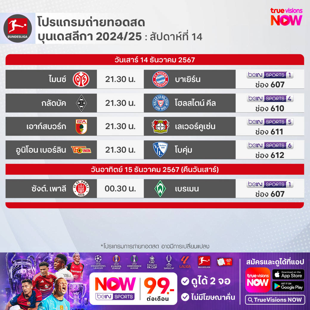 St. Pauli vs Werder Bremen เวลา 00.30-02.30 ทางช่อง beIN 1 (607)
