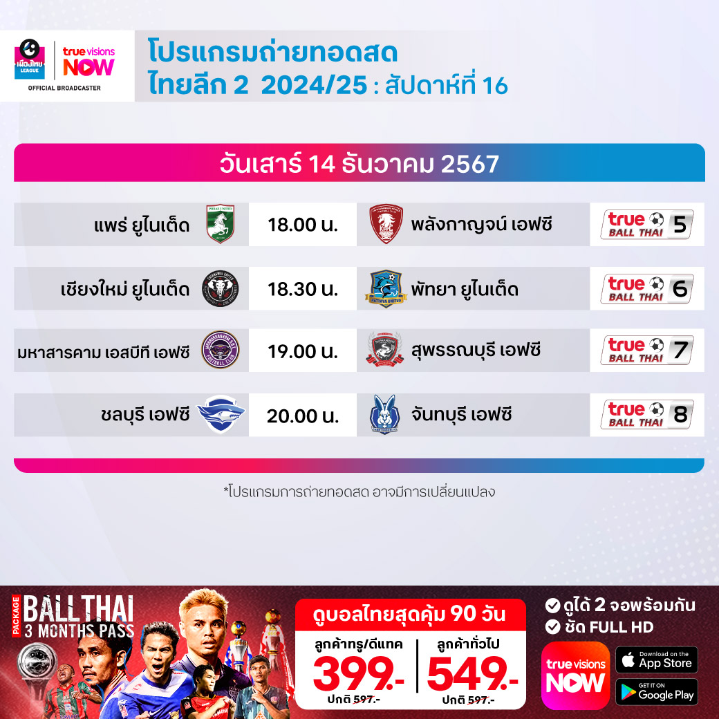 เชียงใหม่ ยูไนเต็ด พบ พัทยา ยูไนเต็ด เวลา 18.30-20.30 True Ball Thai 6