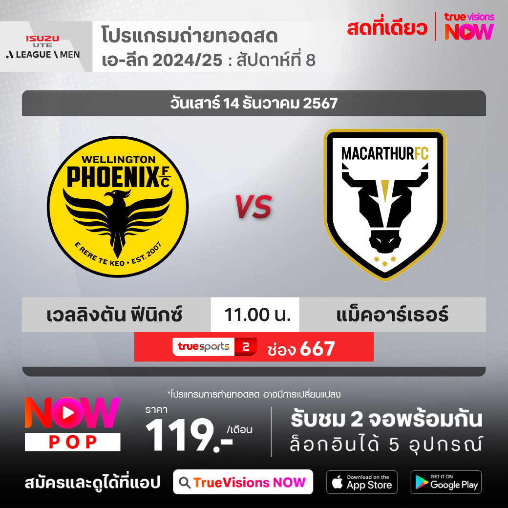 Wellington Phoenix vs Macarther เวลา 11.00-13.00 ทางช่อง TS 2 (667)