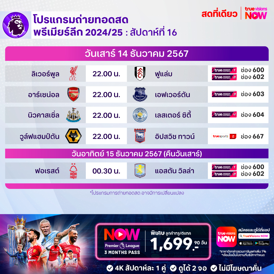 วันนี้มีอะไรดูที่ ทรูวิชั่นส์ ประจำวันเสาร์ที่ 14 ธันวาคม 67 ยังคงมีกีฬาที่น่าสนใจให้ได้ตามลุ้นตามเชียร์กันเหมือนเดิม โดยในส่วนของฟุตบอลนั้น ยังมีศึกพรีเมียร์ลีก อังกฤษ, บุนเดสลีกา เยอรมนี, ลา ลีกา สเปน, อาเซียน คัพ 2024, เอ-ลีก ออสเตรเลีย และ ไทยลีก 1, 2 ให้ได้ตามเชียร์กันอย่างต่อเนื่อง ส่วนกีฬาอื่นๆ ยังมี กอล์ฟ พีจีเอ ทัวร์ รายการ พีจีเอ แกรนท์ ธอร์นตัน อินวิเตชั่นแนล, เวิลด์ สนุกเกอร์ ทัวร์ รายการ สกอตติช โอเพ่น, แบดมินตัน บีดับเบิ้่ลยูเอฟ รายการ เวิลด์ ทัวร์ ไฟนอลส์ และ บาสเกตบอล เอ็นบีเอ คัพ งานนี้ ทรูวิชั่นส์ จัดเต็มให้ชมกันถึงบ้าน