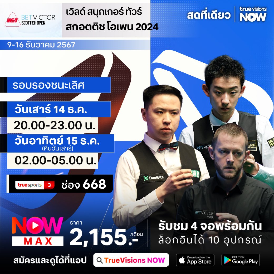 แฟนๆ กีฬาสอยคิวต้องไม่พลาด กับ เวิลด์ สนุกเกอร์ ทัวร์ เก็บคะแนนสะสมโลก รายการ สกอตติช โอเพ่น ที่เป็น 1 ใน 4 ของ โฮม เนชั่นส์ ซีรี่ส์ ที่มีนักสนุกเกอร์เข้าร่วมแข่งขันแย่งชิงตำแหน่งแชมป์และรางวัลโบนัสก้อนโตมากถึง 128 คน ที่สังเวียน มีโดว์แบงค์ เซนเตอร์ ใน เอดินบะระ สกอตแลนด์ ร่วมลุ้นกันว่า ใครจะได้แชมป์ไปครอง พร้อมกับ สตีเฟ่น เฮนดรี้ โทรฟี่ ชมสด เอ็กซ์คลูซีฟ ครบทุกรอบ ที่เดียวที่ ทรูวิชั่นส์