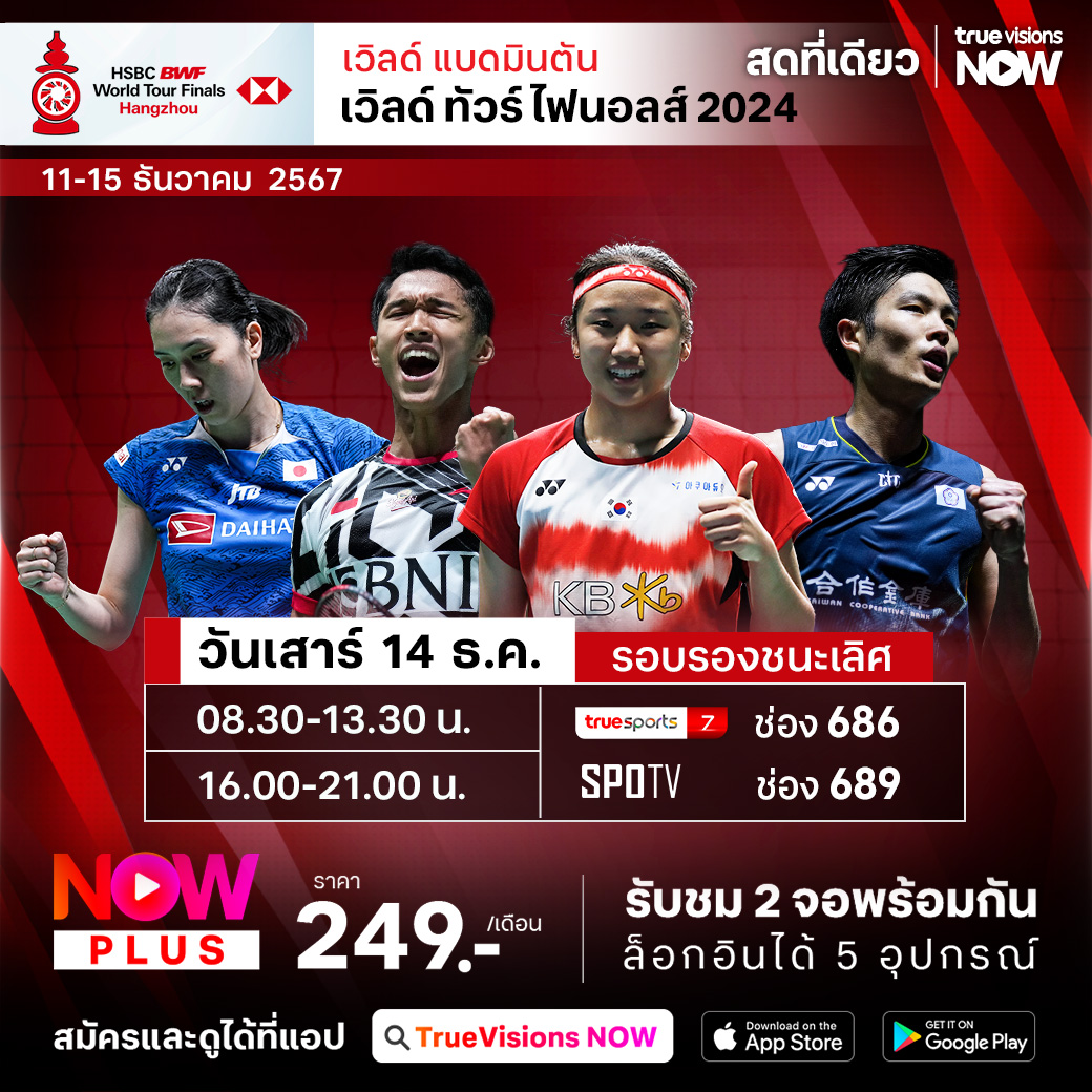 เตรียมปิดฤดูกาลอย่างยิ่งใหญ่ กับแบดมินตันรายการที่แฟนๆ รอคอยอย่าง เวิลด์ ทัวร์ ไฟนอลส์ 2024 ที่เมืองหางโจว ประเทศจีน ร่วมเชียร์นักแบดมินตันไทย นำโดย "วิว" กุลวุฒิ วิทิตศานต์, "เม" ศุภนิดา เกตุทอง และ "ครีม" บุศนันท์ อึ๊งบำรุงพันธุ์ ทำผลงานแข่งกับนักตบลูกขนไก่ระดับสุดยอดของโลก เพื่อตำแหน่งแชมป์แห่งศักดิ์ศรี ชมสด ครบทุกแมตช์ ทุกรอบ แบบเอ็กซ์คลูซีฟ ที่เดียวที่ ทรูวิชั่นส์