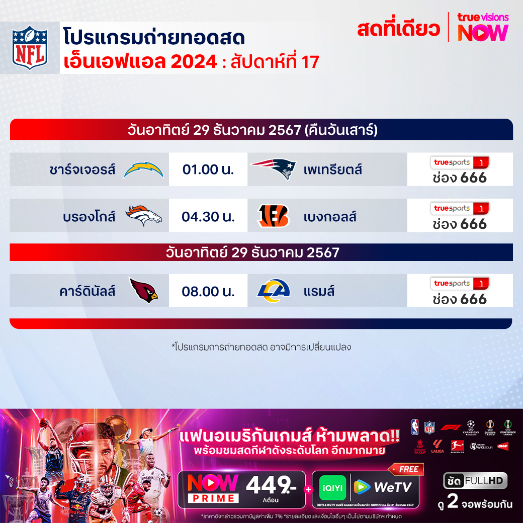 วันอาทิตย์ 29 ธ.ค. Chargers Vs Patriots เวลา 01.00 ทางช่อง TS 1 (666)