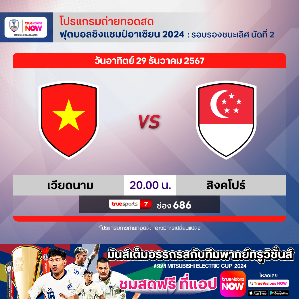 VIETNAM vs SINGAPORE เวลา 20.00-22.00 ทางช่อง TS 7 (686)