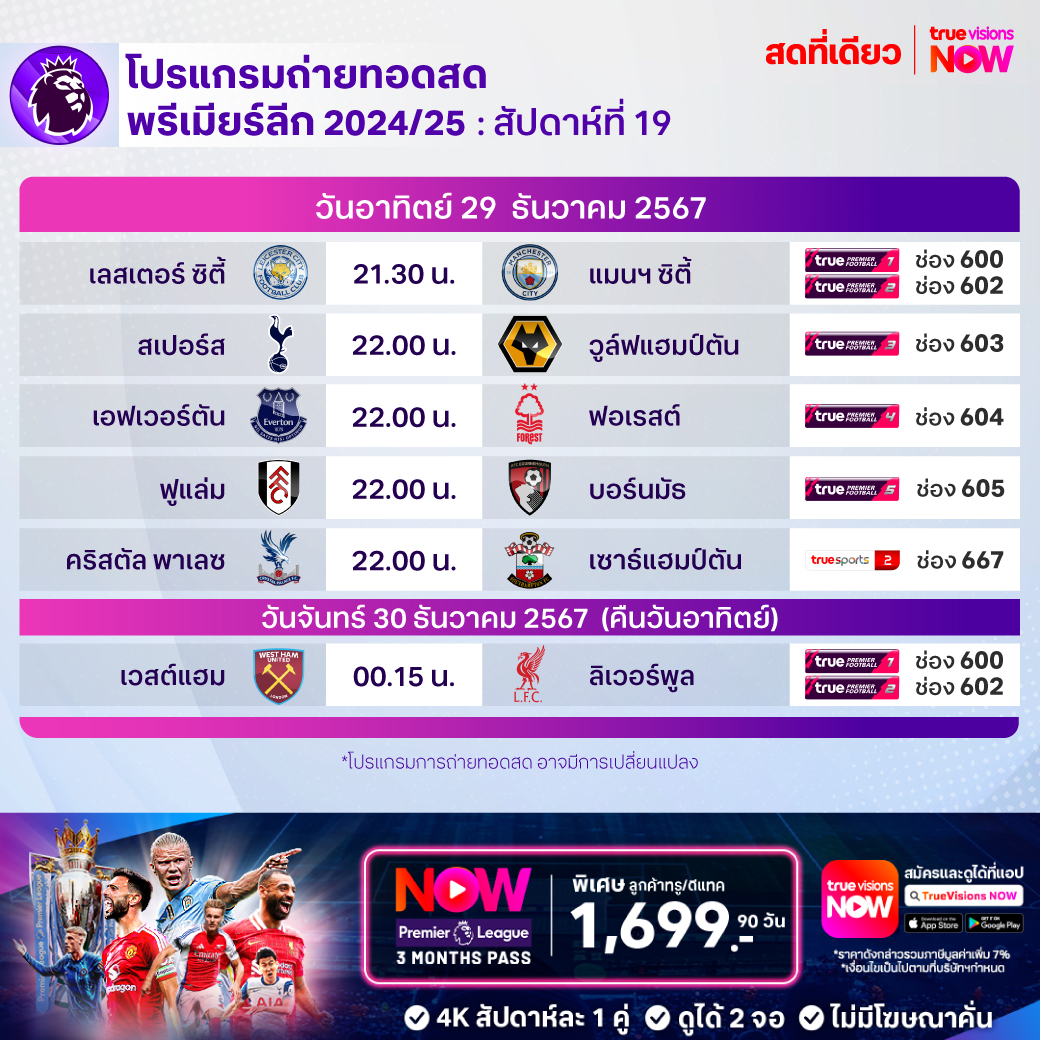 West Ham Utd vs Liverpool เวลา 00:15 - 02:15 ทางช่อง TPF 1 (600) / TPF 2 (602)