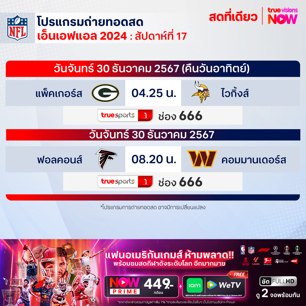 วันจันทร์ 30 ธ.ค. Falcons Vs Commanders เวลา 08.20 ทางช่อง TS 1 (666)