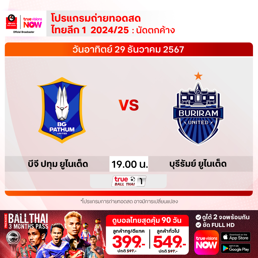 บีจี ปทุม ยูไนเต็ด พบ บุรีรัมย์ ยูไนเต็ด เวลา 19.00-21.00 ทางช่อง True Ball Thai 1