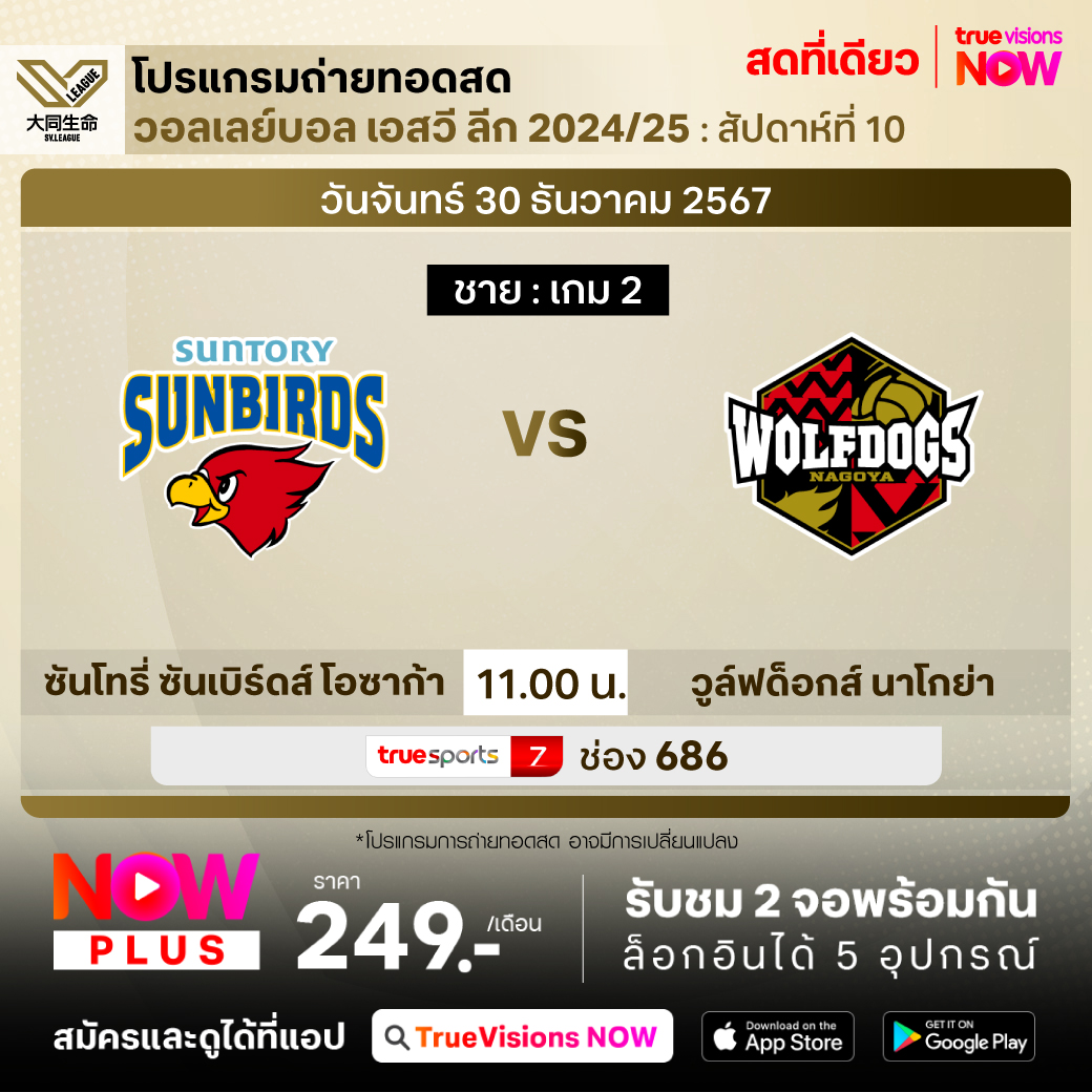ซันโทรี่ ซันเบิร์ดส์ โอซาก้า พบ วูล์ฟด็อกส์ นาโกย่า เวลา 11.00 - 13.30 ทางช่อง TS 7 (686)