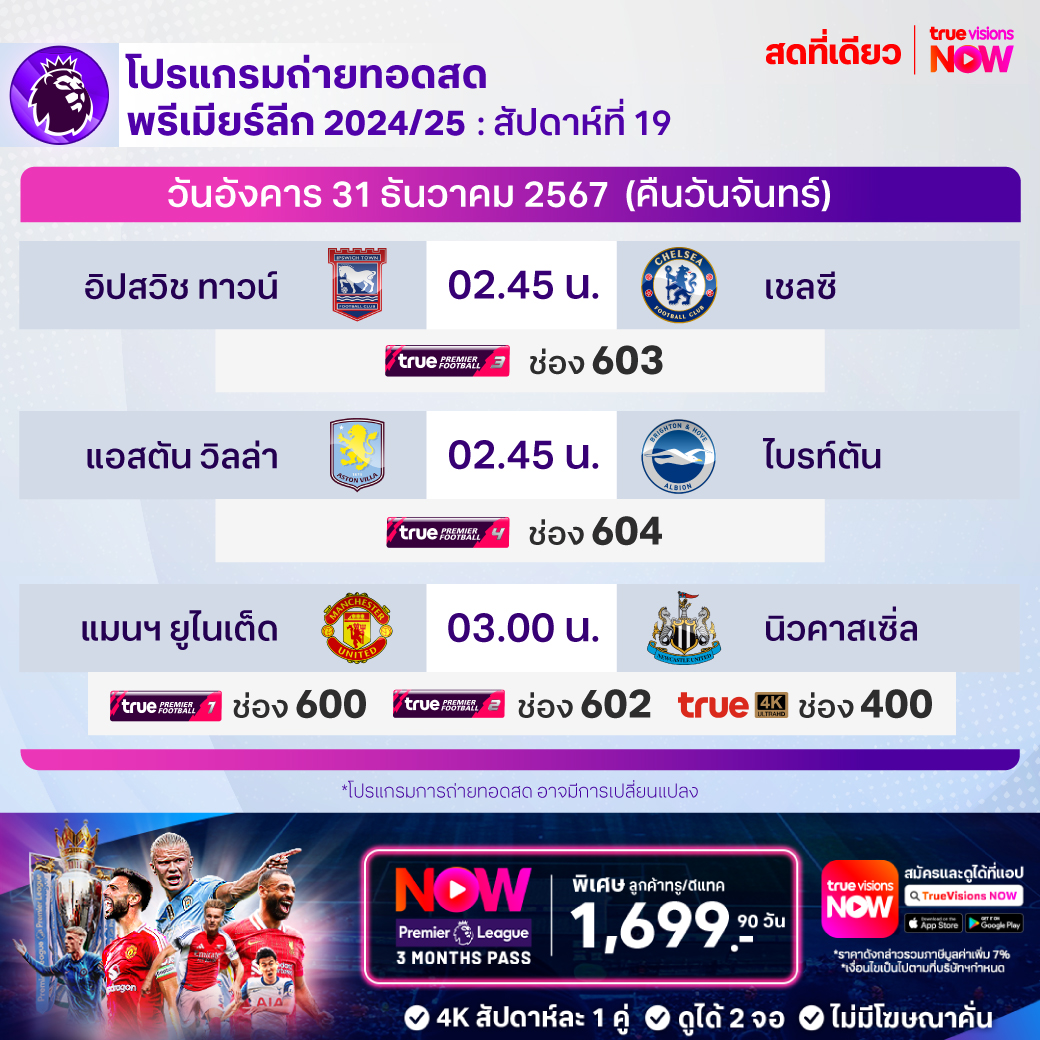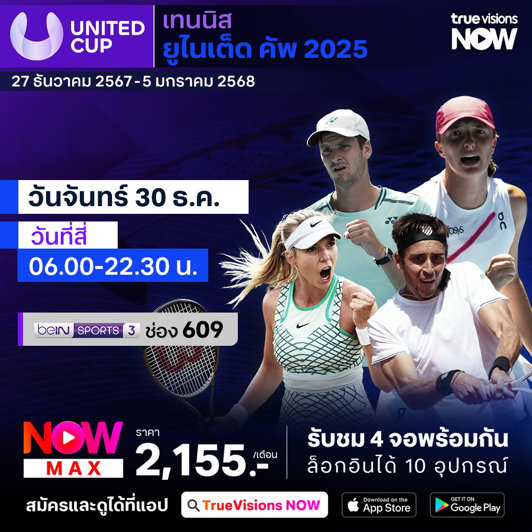 วันนี้มีอะไรดูที่ ทรูวิชั่นส์ ประจำวันจันทร์ที่ 30 ธันวาคม 67 ยังคงมีกีฬาที่น่าสนใจให้ได้ตามลุ้นตามเชียร์กันเหมือนเดิม โดยในส่วนของฟุตบอลยังมีศึกพรีเมียร์ลีก อังกฤษ และ อาเซียน คัพ 2024 ให้ได้ตามเชียร์กันต่อ ส่วนกีฬาอื่นๆ ยังมีเทนนิสรายการทีมผสม ยูไนเต็ด คัพ, เอทีพี ทัวร์ รายการ บริสเบน อินเตอร์เนชั่นแนล, วอลเลย์บอล เอสวี ลีก และ อเมริกันฟุตบอลเอ็นเอฟแอล งานนี้ ทรูวิชั่นส์ จัดเต็มให้ชมกันถึงบ้าน