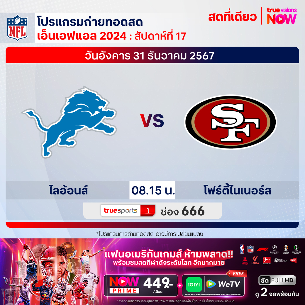 วันอังคาร 31 ธ.ค. Lions Vs 49ers เวลา 08.15 ทางช่อง TS 1 (666)
