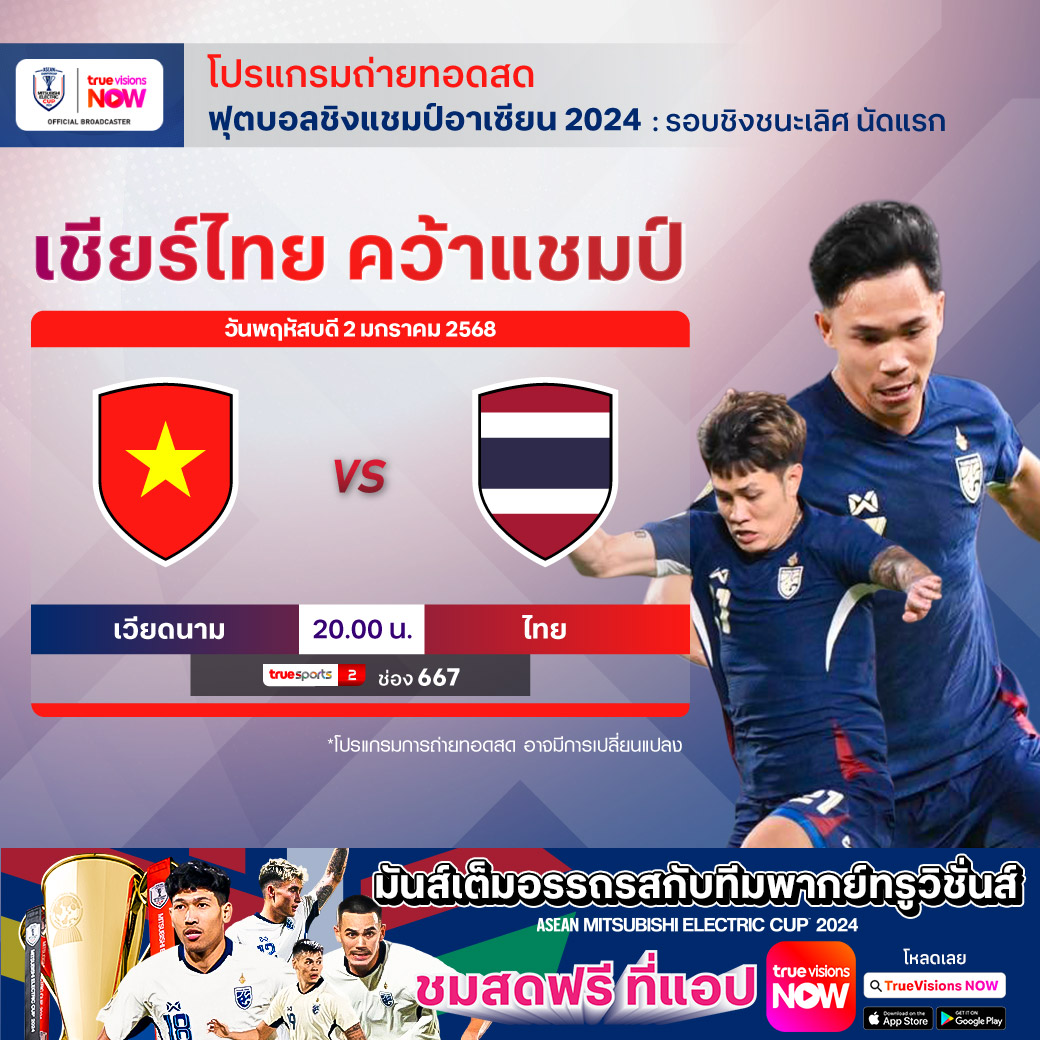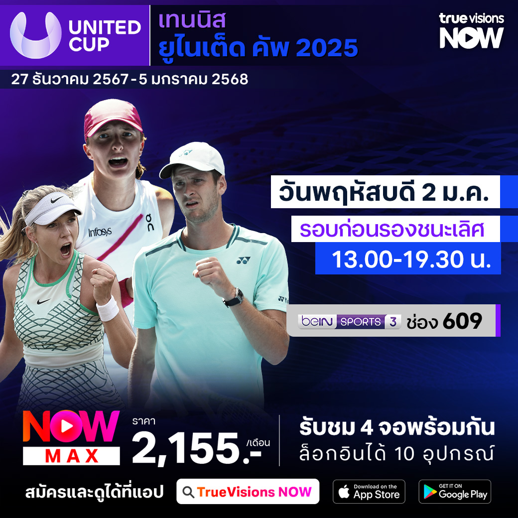 วันนี้มีอะไรดูที่ ทรูวิชั่นส์ ประจำวันพฤหัสบดีที่ 2 มกราคม 68 ยังคงมีกีฬาที่น่าสนใจให้ได้ตามลุ้นตามเชียร์กันเหมือนเดิม โดยในส่วนของฟุตบอลยังมีศึก อาเซียน คัพ 2024 รอบชิงชนะเลิศนัดแรก ให้ได้ตามเชียร์กันต่อ ส่วนกีฬาอื่นๆ ยังมีเทนนิสรายการทีมผสม ยูไนเต็ด คัพ, เอทีพี ทัวร์ และ ดับเบิ้ลยูทีเอ ทัวร์ รายการ บริสเบน อินเตอร์เนชั่นแนล, ดับเบิ้ลยูทีเอ ทัวร์ รายการ ออคแลนด์ คลาสสิก และ กอล์ฟ พีจีเอ ทัวร์ รายการ เดอะ เซนทรี่ งานนี้ ทรูวิชั่นส์ จัดเต็มให้ชมกันถึงบ้าน