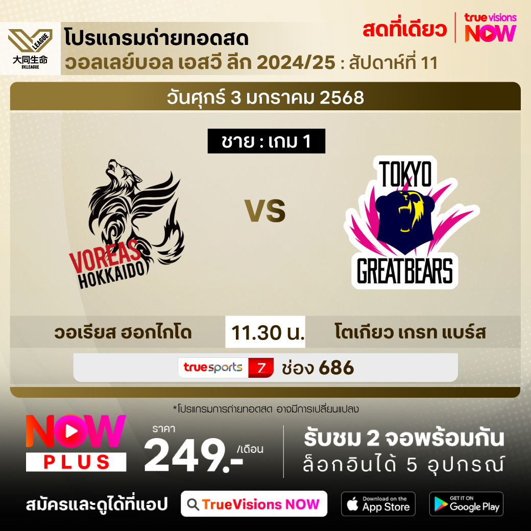 วอเรียส ฮอกไกโด พบ โตเกียว เกรท แบร์ส เวลา 11.30 - 14.00 ทางช่อง TS7