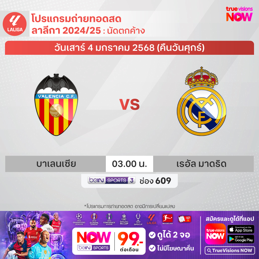 Valencia vs Real Madrid เวลา 03.00-05.00 ทางช่อง beIN 3 (609)