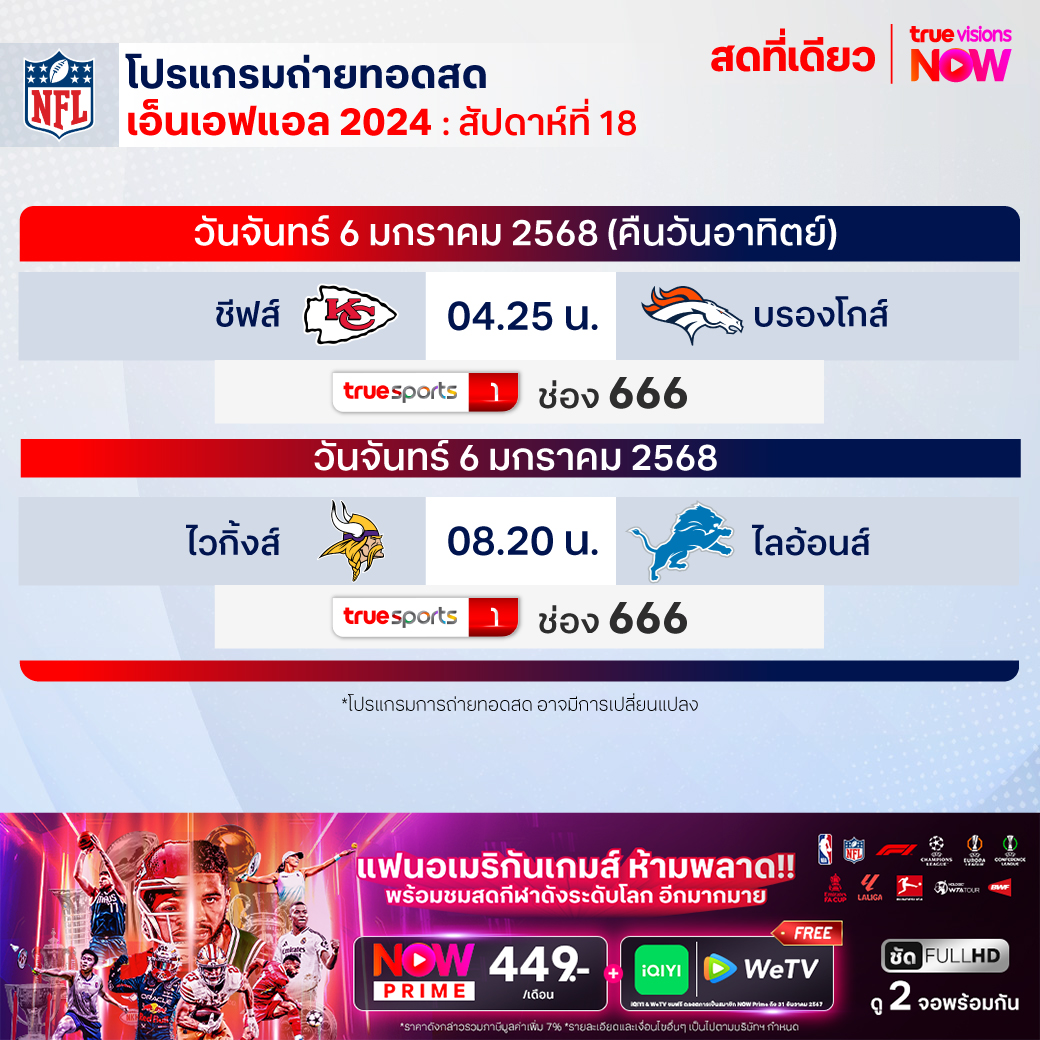 วันจันทร์ 6 ม.ค. Chiefs Vs Broncos เวลา 04.25 ทางช่อง TS 1 (666)