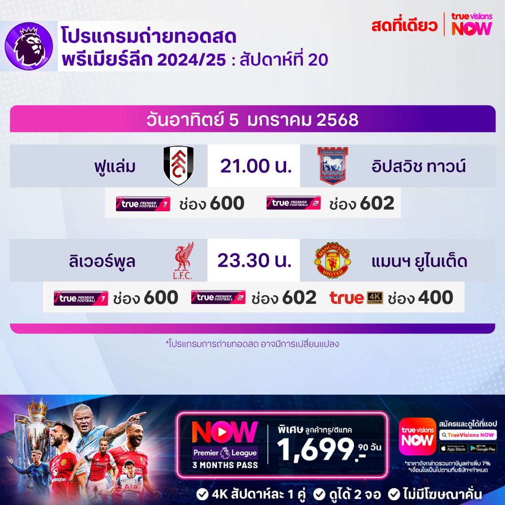 Liverpool vs Man Utd เวลา 23:30 - 01:30 ทางช่อง TPF 1 (600) / TPF 2 (602) /4K(400)