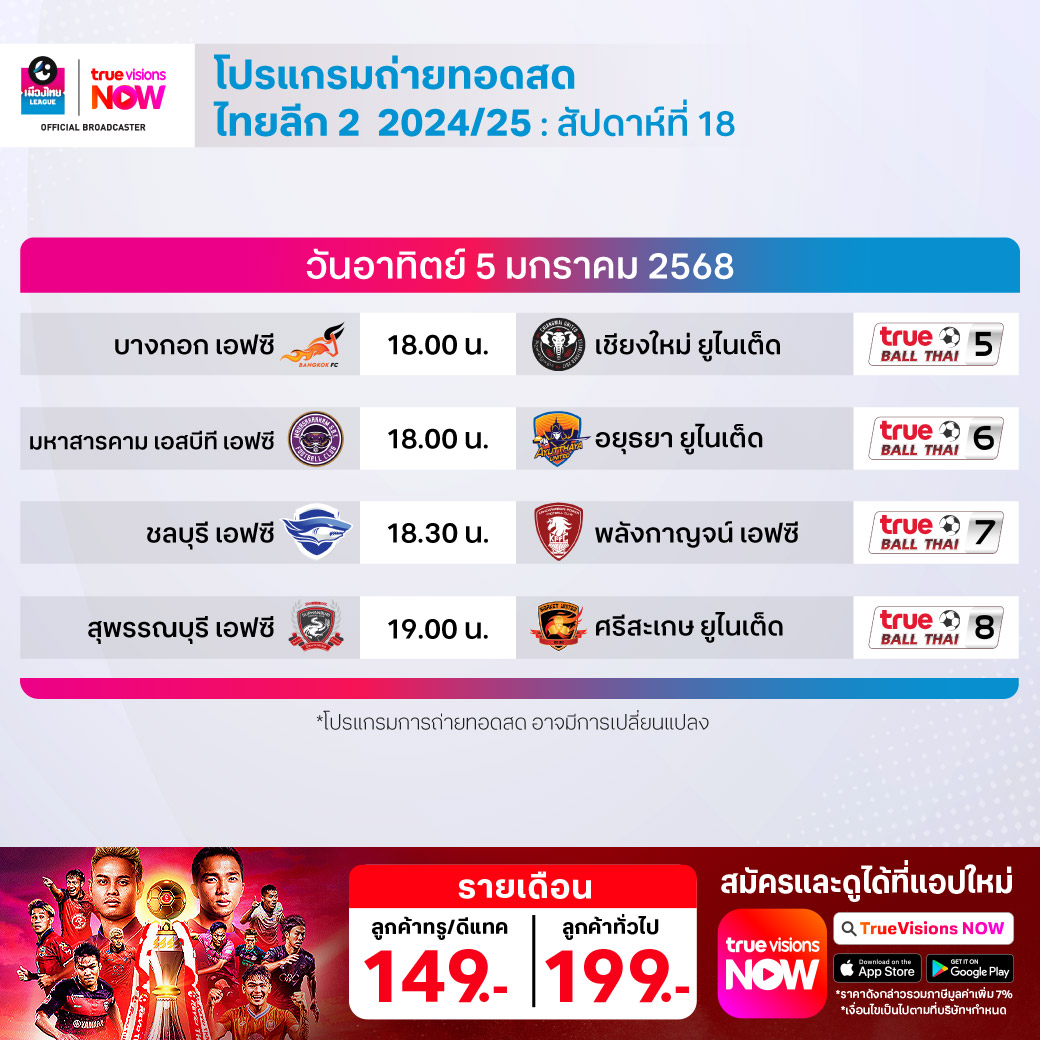 มหาสารคาม เอสบีที เอฟซี พบ อยุธยา ยูไนเต็ด เวลา 18.00-20.00 ทางช่อง True Ball Thai 6