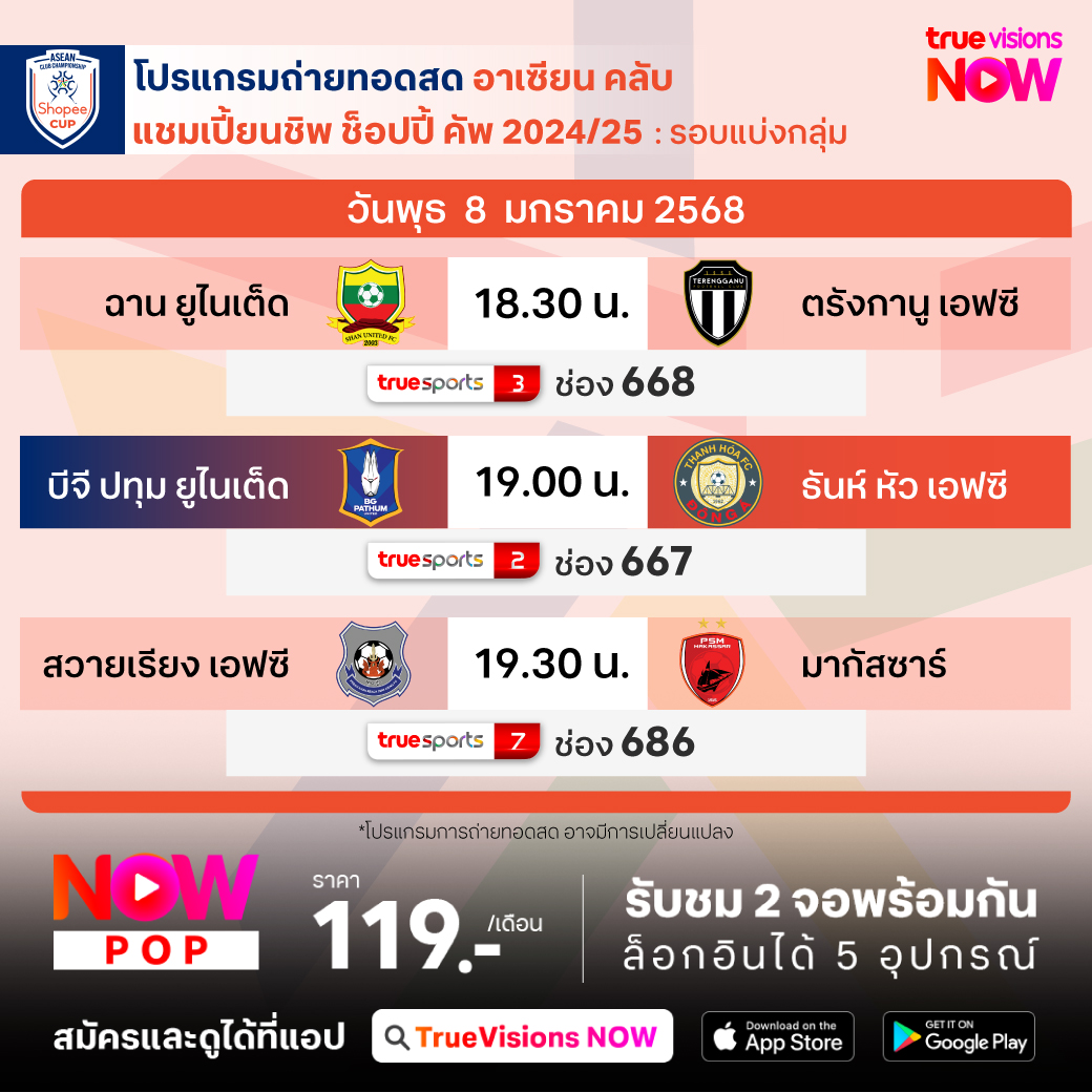 BG PATHUM UNITED vs THANH HOA FC เวลา 19.00-21.00 ทางช่อง TS 2 (667)