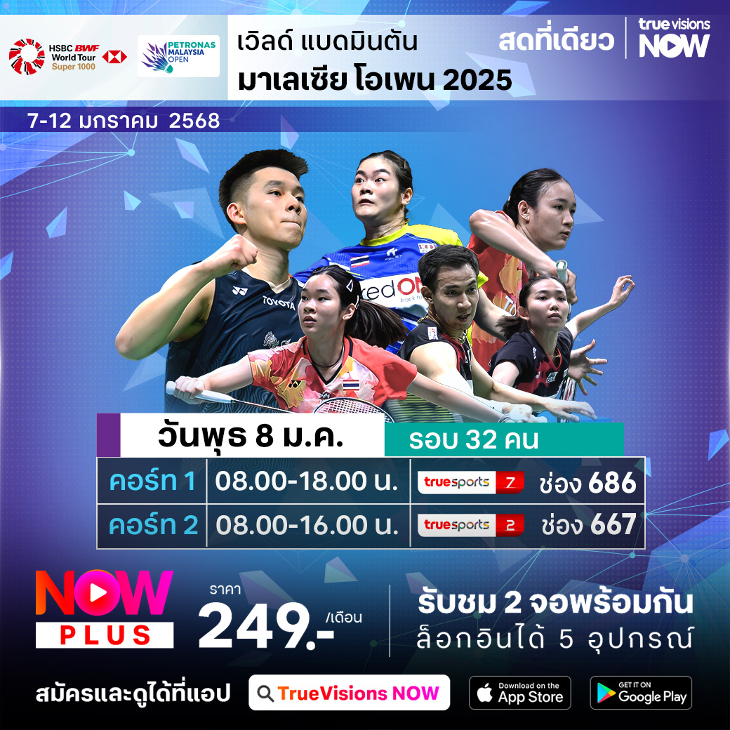 แบดมินตัน บีดับเบิ้ลยูเอฟ เปิดฤดูกาลใหม่ กับความมันส์ระดับ เวิลด์ ทัวร์ ซูเปอร์ 1000 มาเลเซีย โอเพ่น 2025 ที่ระดมเอามือท็อปของโลกทั้งชายและหญิงจากทุกทวีป ร่วมเชียร์นักแบดมินตันไทยที่คัดมือดีที่สุดไปร่วมแข่งขัน ที่มีคะแนนสะสมและเงินรางวัลให้ชิงกันมากถึง 1,450,000 เหรียญสหรัฐฯ ใครจะคว้าชัย ใครจะไปต่อถึงตำแหน่งแชมป์ ชมสดครบทุกรอบ เอ็กซ์คลูซีฟ ที่เดียวที่ ทรูวิชั่นส์