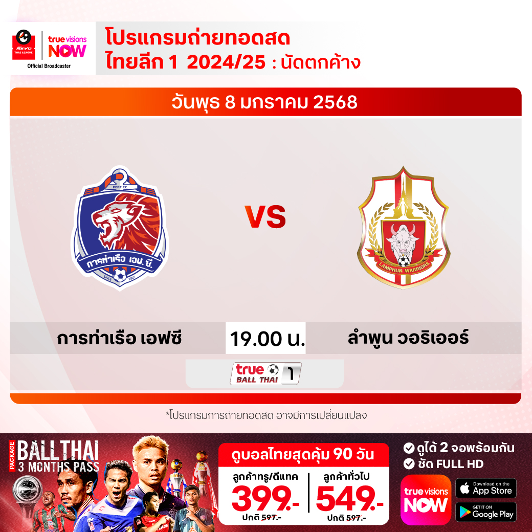 การท่าเรือ เอฟซี พบ ลำพูน วอริเออร์ เวลา 19.00-21.00 ทางช่อง True Ball Thai 1