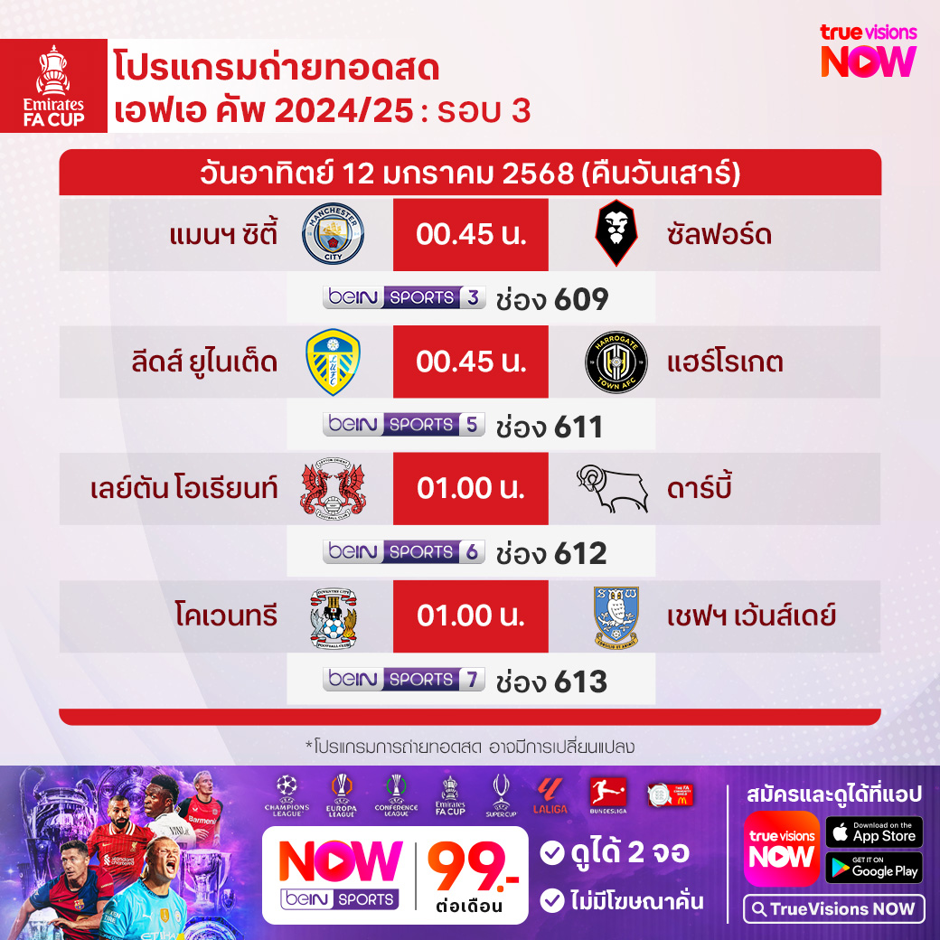 วันนี้มีอะไรดูที่ ทรูวิชั่นส์ ประจำวันเสาร์ที่ 11 มกราคม 68 ยังคงมีกีฬาที่น่าสนใจให้ได้ตามลุ้นตามเชียร์กันเหมือนเดิม โดยในส่วนของฟุตบอลยังมีศึกเอฟเอ คัพ อังกฤษ, บุนเดสลีกา เยอรมนี, ลา ลีกา สเปน, เอ-ลีก ออสเตรเลีย, ซาอุดิ โปร ลีก และ ไทยลีก ให้ได้ตามเชียร์กันต่อ ส่วนกีฬาอื่นๆ ยังมีเทนนิสดับเบิ้ลยูทีเอ ทัวร์ รายการ แอดิเลด อินเตอร์เนชั่นแนล และ โฮบาร์ต อินเตอร์เนชั่นแนล, กอล์ฟ พีจีเอ ทัวร์ รายการ โซนี่ โอเพ่น อิน ฮาวาย, แบดมินตัน บีดับเบิ้ลยูเอฟ รายการ มาเลเซีย โอเพ่น, ศึกยูเอฟซี ไฟต์ ไนท์, วอลเลย์บอล แอลโอวีบี, วอลเลย์บอล เอสวี ลีก และศึกอเมริกันฟุตบอลเอ็นเอฟแอล งานนี้ ทรูวิชั่นส์ จัดเต็มให้ชมกันถึงบ้าน