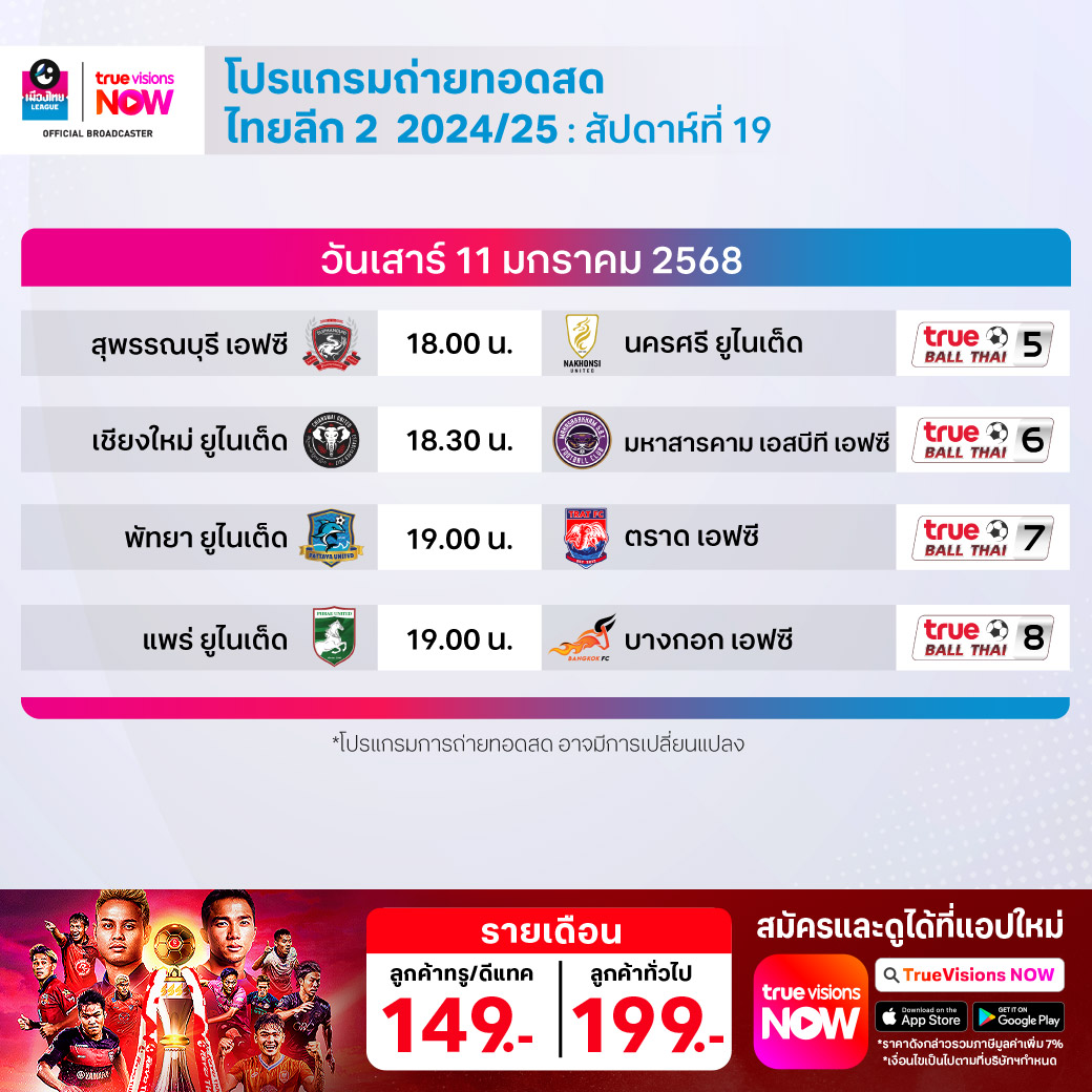 พัทยา ยูไนเต็ด พบ ตราด เอฟซี เวลา 19.00-21.00 ทางช่อง True Ball Thai 7