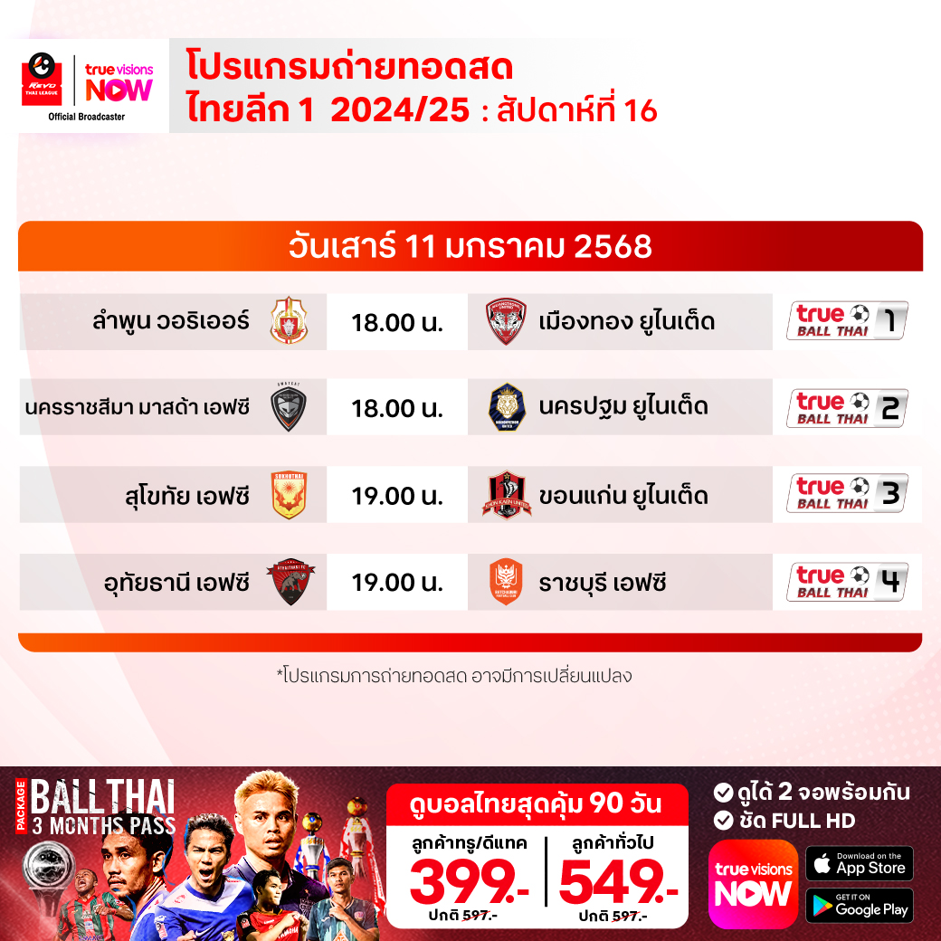 ลำพูน วอริเออร์ พบ เมืองทอง ยูไนเต็ด เวลา 18.00-20.00 ทางช่อง True Ball Thai 1