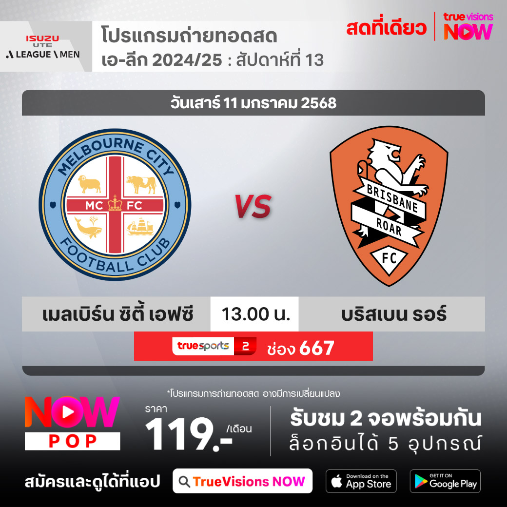Melbourne City FC vs Brisbane Roar เวลา 13.00-15.00 ทางช่อง TS 2 (667)