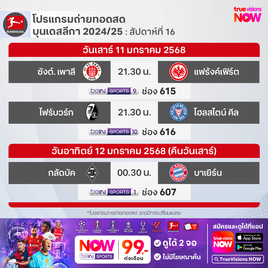 Monchengladbach vs Bayern เวลา 00.30-02.30 ทางช่อง beIN 1 (607)