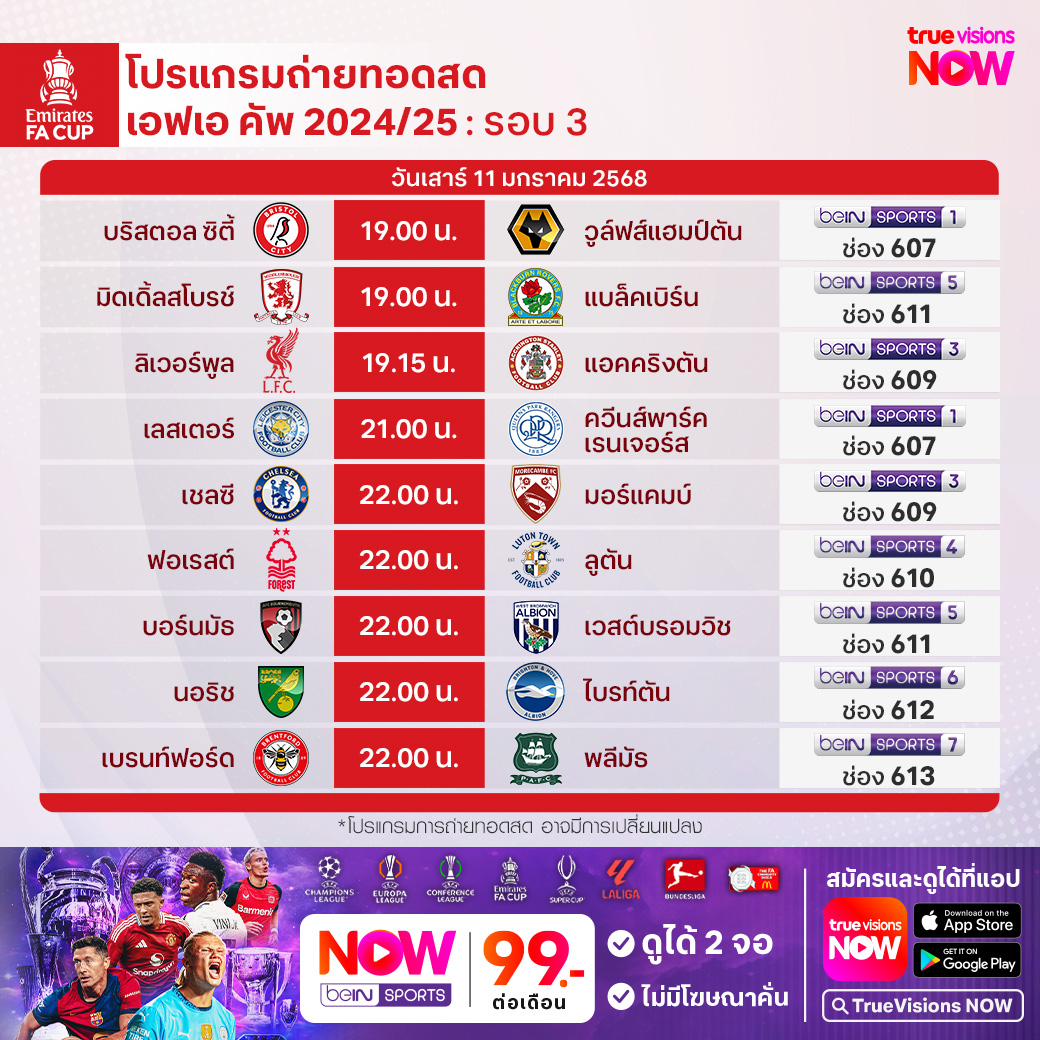 Chelsea vs Morecambe เวลา 22.00-00.00 ทางช่อง beIN 3 (609)