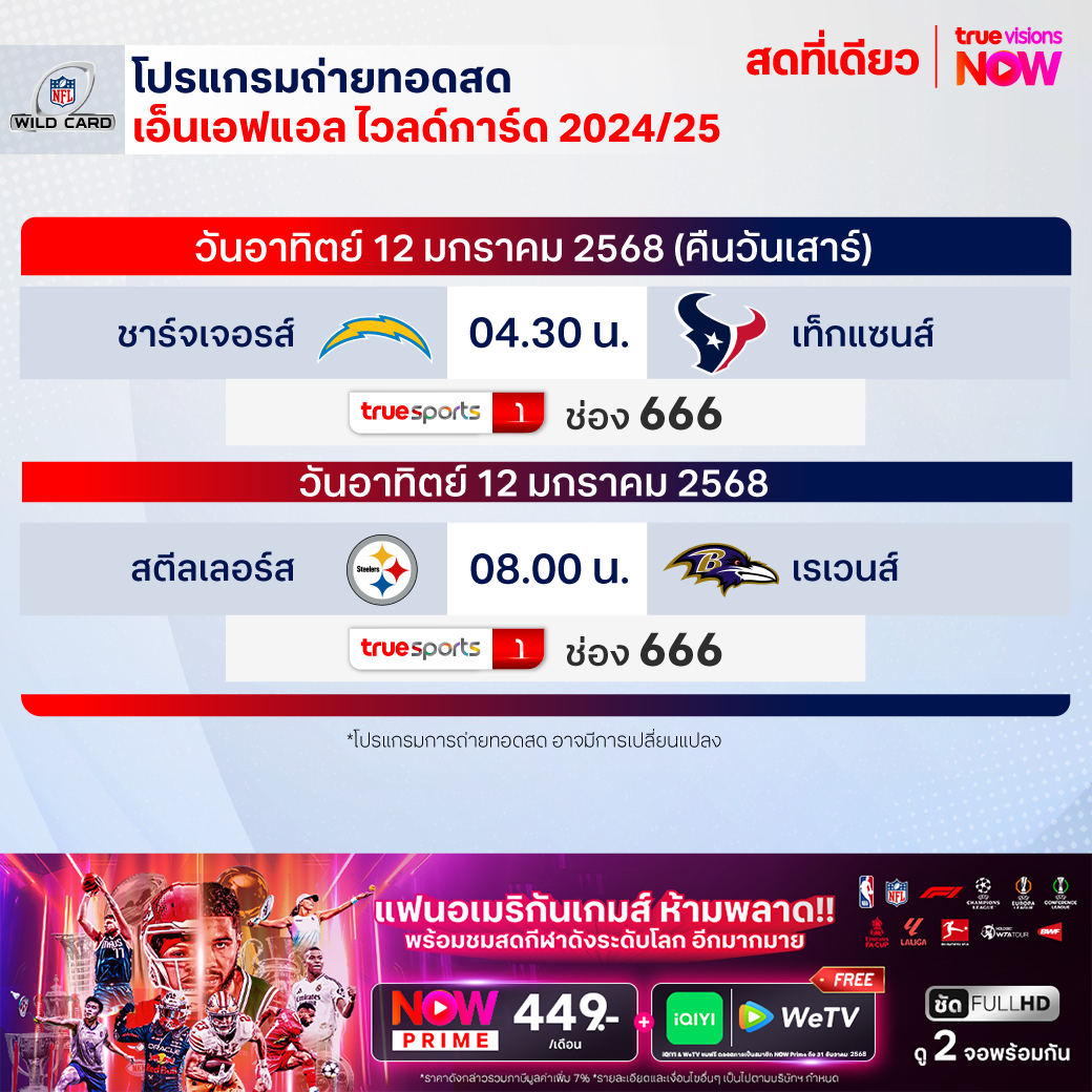 วันอาทิตย์ 12 ม.ค. Steelers VS Ravens เวลา 08.00 ทางช่อง TS 1 (666)