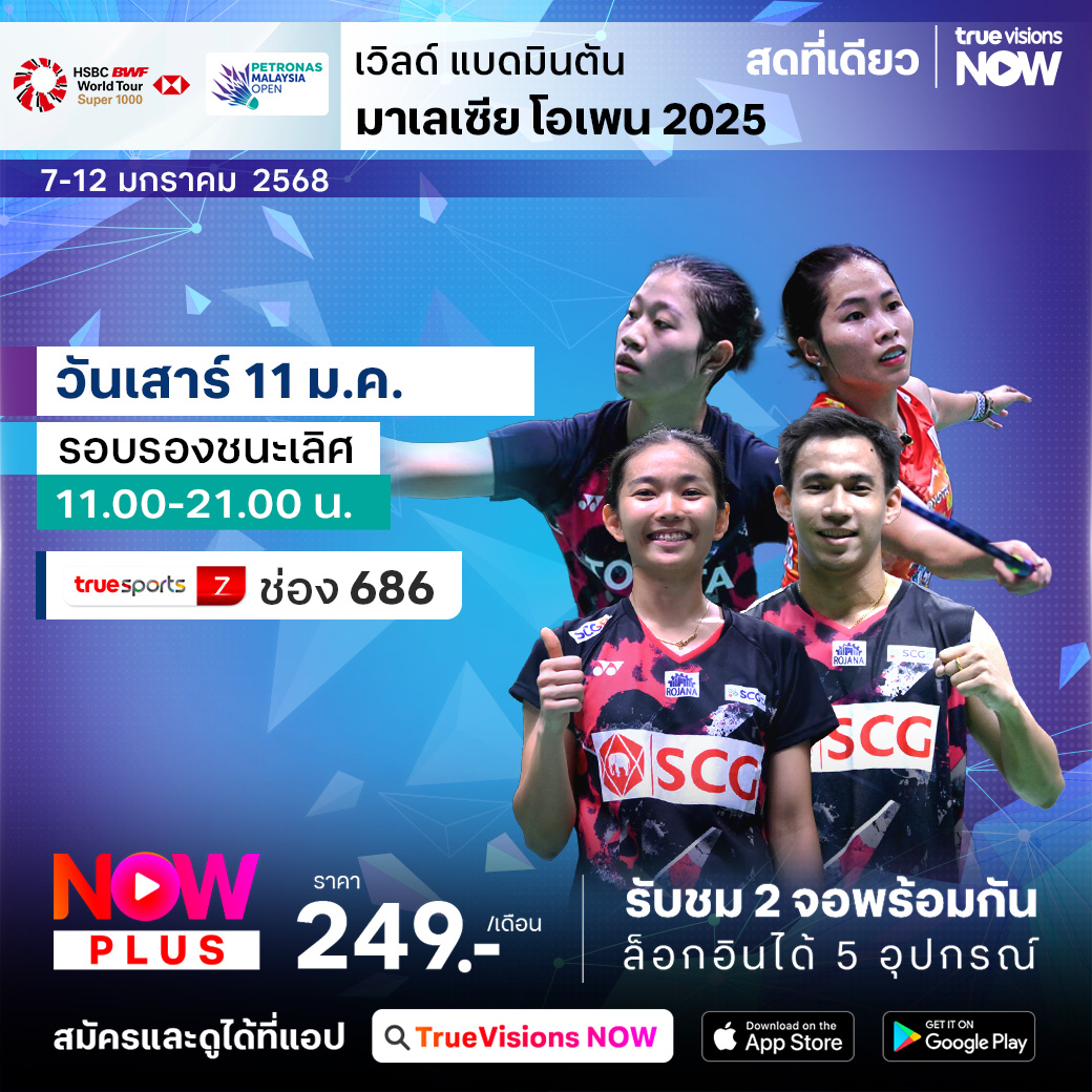 แบดมินตัน บีดับเบิ้ลยูเอฟ เปิดฤดูกาลใหม่ กับความมันส์ระดับ เวิลด์ ทัวร์ ซูเปอร์ 1000 มาเลเซีย โอเพ่น 2025 ที่ระดมเอามือท็อปของโลกทั้งชายและหญิงจากทุกทวีป ร่วมเชียร์นักแบดมินตันไทยที่คัดมือดีที่สุดไปร่วมแข่งขัน ที่มีคะแนนสะสมและเงินรางวัลให้ชิงกันมากถึง 1,450,000 เหรียญสหรัฐฯ ใครจะคว้าชัย ใครจะไปต่อถึงตำแหน่งแชมป์ ชมสดครบทุกรอบ เอ็กซ์คลูซีฟ ที่เดียวที่ ทรูวิชั่นส์