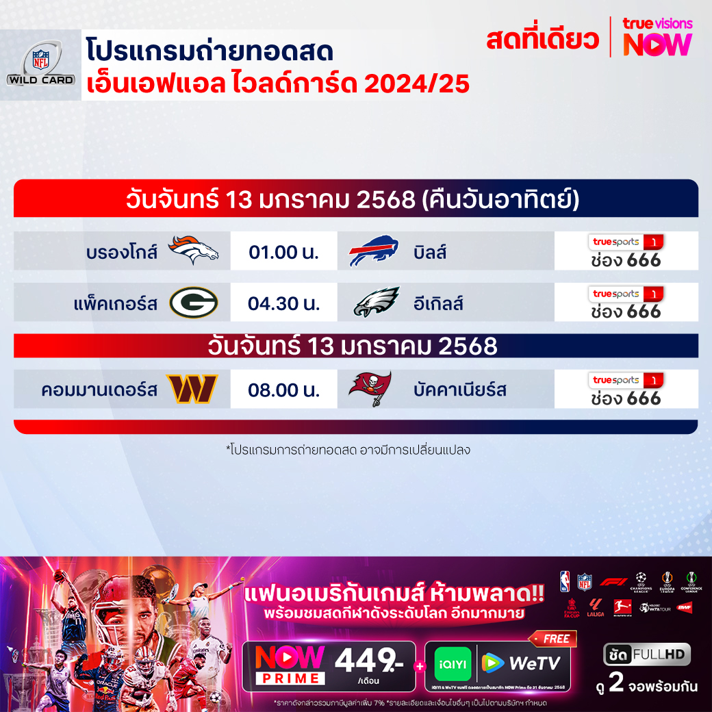 วันจันทร์ 13 ม.ค. Broncos Vs Bills เวลา 01.00 ทางช่อง TS 1 (666)