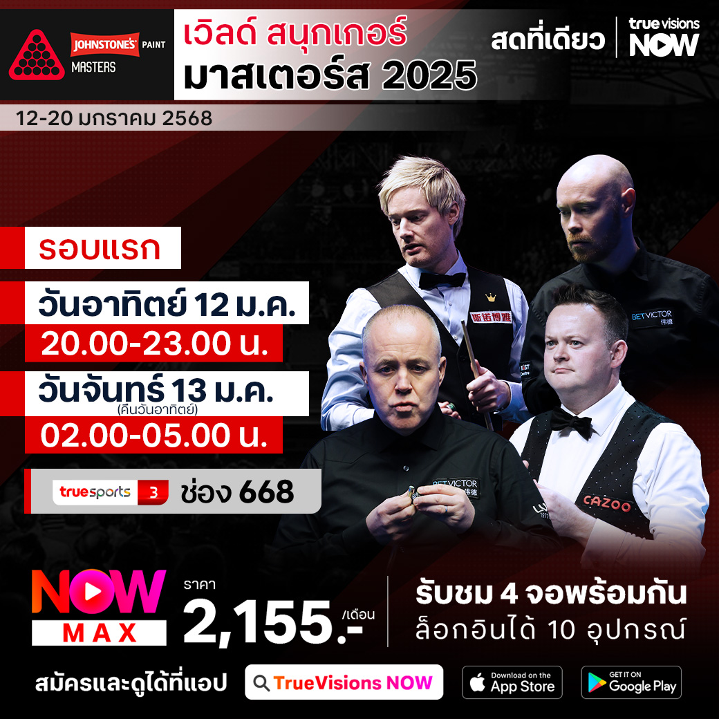 แฟนๆ สนุกเกอร์พลาดไม่ได้ กับการมาถึงของรายการ มาสเตอร์ส 1 ใน 3 ของรายการระดับ ทริปเปิ้ล คราวน์ ซีรี่ส์ กับรายการ จอห์นสโตนส์ เพนท์ มาสเตอร์ส ประเดิมศักราชใหม่ 2025 เตรียมพบกับนักสอยคิวมือพระกาฬระดับท็อป 16 ของโลก ร่วมชิงชัยในรายการแห่งศักดิ์ศรี ที่มันส์ทุกเฟรม ตื่นเต้นทุกแมตช์ ใครจะคว้าโทรฟี่แชมป์พร้อมกับเงินรางวัลกว่า 350,000 ปอนด์ ชมสด เอ็กซ์คลูซีฟ จาก อเล็กซานดร้า พาเลซ กรุงลอนดอน ที่เดียวที่ ทรูวิชั่นส์