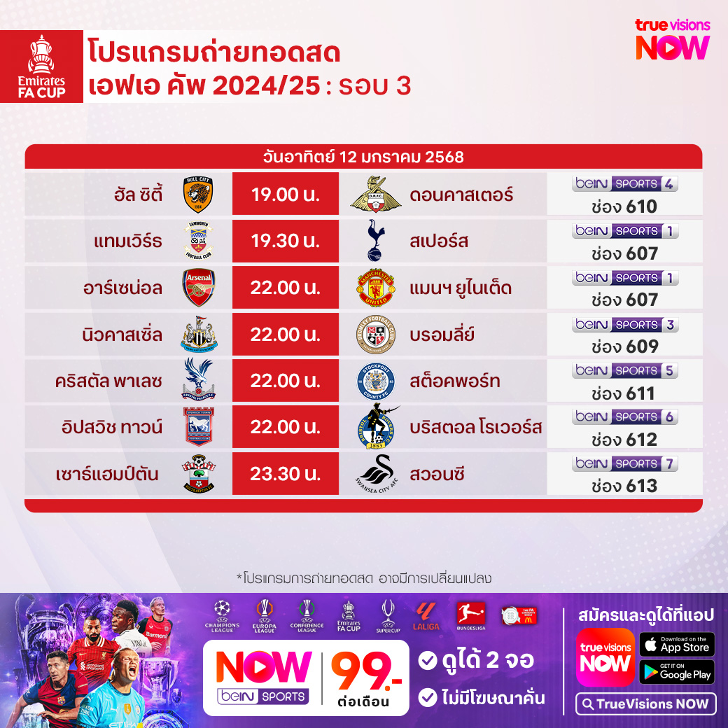วันนี้มีอะไรดูที่ ทรูวิชั่นส์ ประจำวันอาทิตย์ที่ 12 มกราคม 68 ยังคงมีกีฬาที่น่าสนใจให้ได้ตามลุ้นตามเชียร์กันเหมือนเดิม โดยในส่วนของฟุตบอลยังมีศึกเอฟเอ คัพ อังกฤษ, บุนเดสลีกา เยอรมนี, ลา ลีกา สเปน และ ไทยลีก ให้ได้ตามเชียร์กันต่อ ส่วนกีฬาอื่นๆ พลาดไม่ได้กับศึกเทนนิส ออสเตรเลียน โอเพ่น แกรนด์สแลมแรกของปี, กอล์ฟ พีจีเอ ทัวร์ รายการ โซนี่ โอเพ่น อิน ฮาวาย, แบดมินตัน บีดับเบิ้ลยูเอฟ รายการ มาเลเซีย โอเพ่น, เวิลด์ สนุกเกอร์ ทัวร์ รายการ จอห์นสโตนส์ เพนท์ มาสเตอร์ส, วอลเลย์บอล เอสวี ลีก และศึกอเมริกันฟุตบอลเอ็นเอฟแอล งานนี้ ทรูวิชั่นส์ จัดเต็มให้ชมกันถึงบ้าน