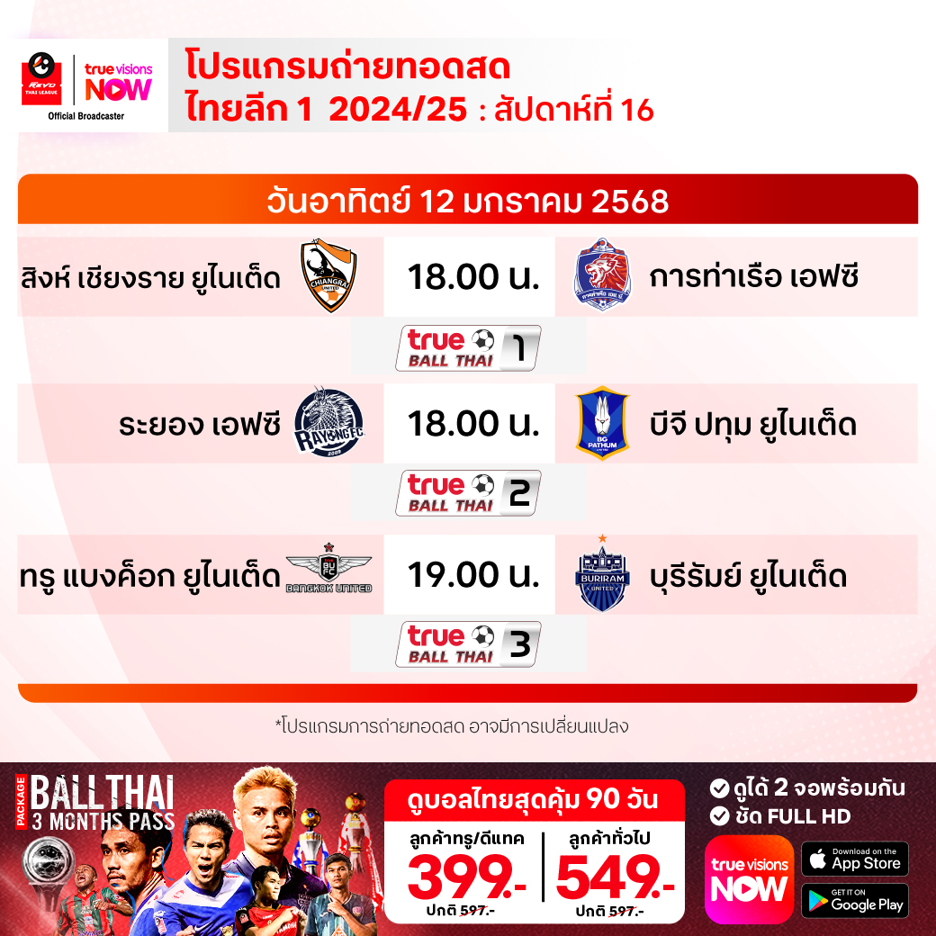 ทรู แบงค็อก ยูไนเต็ด พบ บุรีรัมย์ ยูไนเต็ด เวลา 19.00-21.00 ทางช่อง True Ball Thai 3