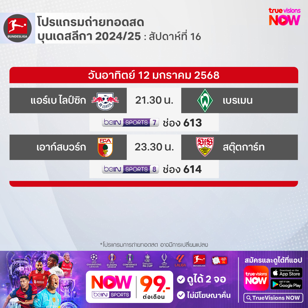 Leipzig vs Werder Bremen เวลา 21.30-23.30 ทางช่อง beIN 7 (613)