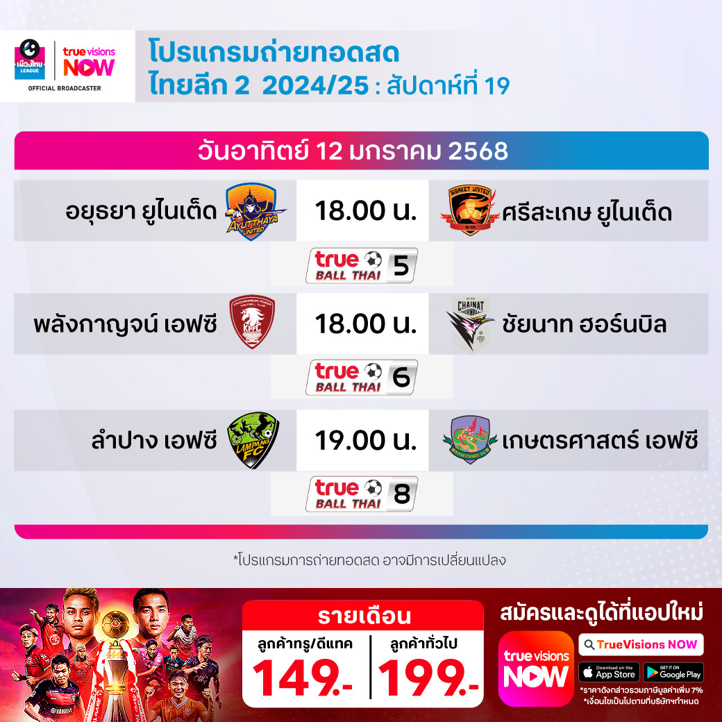อยุธยา ยูไนเต็ด พบ ศรีสะเกษ ยูไนเต็ด เวลา 18.00-20.00 ทางช่อง True Ball Thai 5