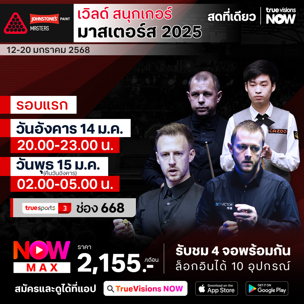 แฟนๆ สนุกเกอร์พลาดไม่ได้ กับการมาถึงของรายการ มาสเตอร์ส 1 ใน 3 ของรายการระดับ ทริปเปิ้ล คราวน์ ซีรี่ส์ กับรายการ จอห์นสโตนส์ เพนท์ มาสเตอร์ส ประเดิมศักราชใหม่ 2025 เตรียมพบกับนักสอยคิวมือพระกาฬระดับท็อป 16 ของโลก ร่วมชิงชัยในรายการแห่งศักดิ์ศรี ที่มันส์ทุกเฟรม ตื่นเต้นทุกแมตช์ ใครจะคว้าโทรฟี่แชมป์พร้อมกับเงินรางวัลกว่า 350,000 ปอนด์ ชมสด เอ็กซ์คลูซีฟ จาก อเล็กซานดร้า พาเลซ กรุงลอนดอน ที่เดียวที่ ทรูวิชั่นส์