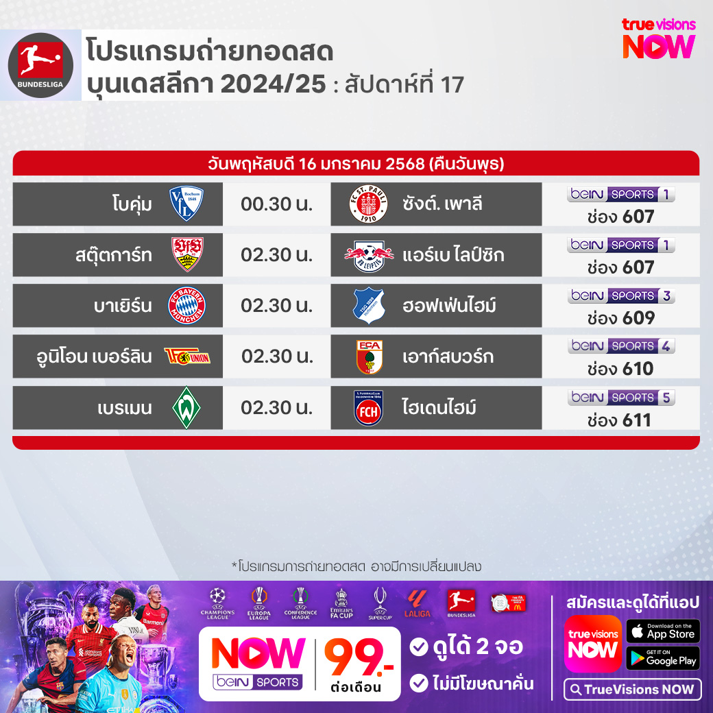Werder Bremen vs Heidenheim เวลา 02.30-04.30 ทางช่อง beIN 5 (611)