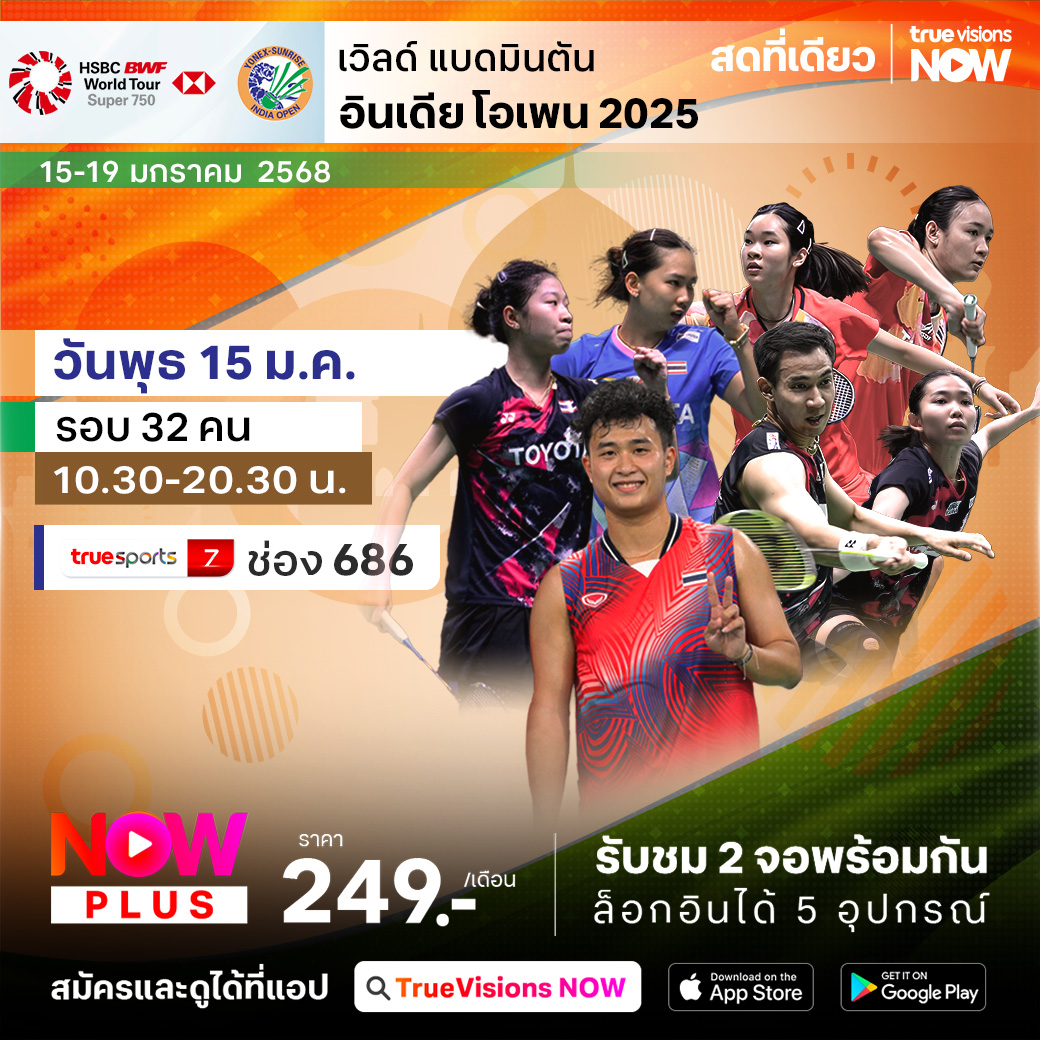 เวิลด์ แบดมินตัน รายการเก็บคะแนนสะสมโลก ฤดูกาล 2025 ที่ ทรูวิชั่นส์ คว้าลิขสิทธิ์มาถ่ายทอดสดให้แฟนๆ ได้เชียร์ไทยกันยาวๆ ตลอดทั้งฤดูกาล สัปดาห์นี้ ไปกันต่อที่แดนภารตะ กับรายการ อินเดีย โอเพ่น ความมันส์ระดับ เวิลด์ ทัวร์ ซูเปอร์ 750 ร่วมส่งใจเชียร์ทีมแบดของไทย ใส่กันไม่ยั้งกับนักแบดนานาชาติ ชมสด ครบทุกรอบ จากกรุงนิวเดลี ประเทศอินเดีย เอ็กซ์คลูซีฟ ที่เดียวที่ ทรูวิชั่นส์