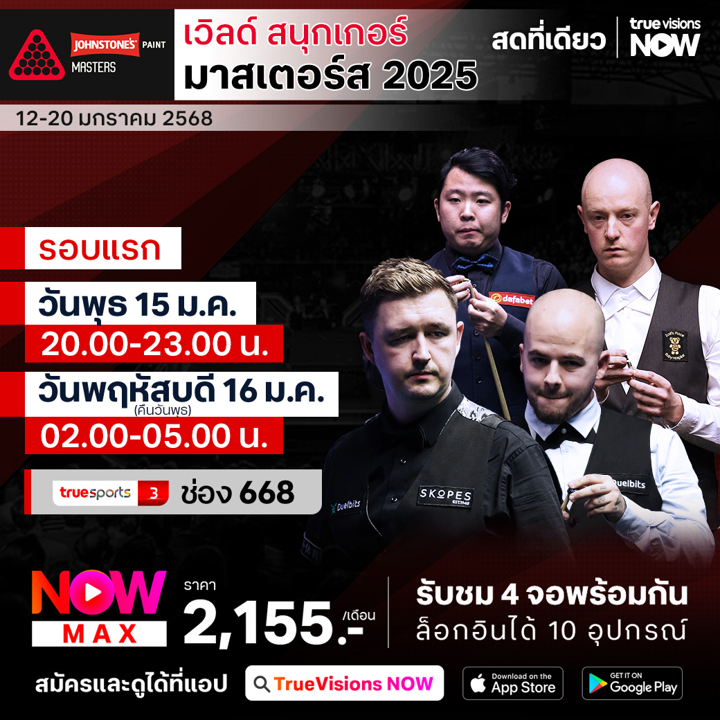 แฟนๆ สนุกเกอร์พลาดไม่ได้ กับการมาถึงของรายการ มาสเตอร์ส 1 ใน 3 ของรายการระดับ ทริปเปิ้ล คราวน์ ซีรี่ส์ กับรายการ จอห์นสโตนส์ เพนท์ มาสเตอร์ส ประเดิมศักราชใหม่ 2025 เตรียมพบกับนักสอยคิวมือพระกาฬระดับท็อป 16 ของโลก ร่วมชิงชัยในรายการแห่งศักดิ์ศรี ที่มันส์ทุกเฟรม ตื่นเต้นทุกแมตช์ ใครจะคว้าโทรฟี่แชมป์พร้อมกับเงินรางวัลกว่า 350,000 ปอนด์ ชมสด เอ็กซ์คลูซีฟ จาก อเล็กซานดร้า พาเลซ กรุงลอนดอน ที่เดียวที่ ทรูวิชั่นส์