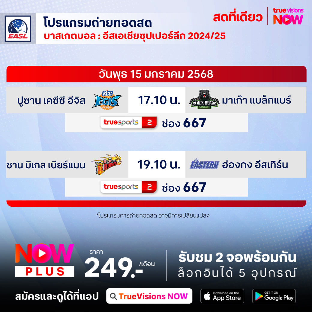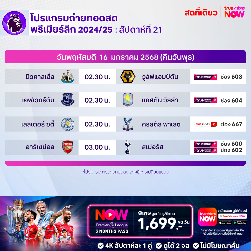 วันนี้มีอะไรดูที่ ทรูวิชั่นส์ ประจำวันพุธที่ 15 มกราคม 68 ยังคงมีกีฬาที่น่าสนใจให้ได้ตามลุ้นตามเชียร์กันเหมือนเดิม โดยในส่วนของฟุตบอลยังมีศึกพรีเมียร์ลีก อังกฤษ, บุนเดสลีกา เยอรมนี, เอ-ลีก ออสเตรเลีย และไทยลีก ให้ได้ตามเชียร์กันต่อ ส่วนกีฬาอื่นๆ พลาดไม่ได้กับศึกเทนนิส ออสเตรเลียน โอเพ่น แกรนด์สแลมแรกของปี, แบดมินตัน บีดับเบิ้ลยูเอฟ รายการ อินเดีย โอเพ่น, เวิลด์ สนุกเกอร์ ทัวร์ รายการ จอห์นสโตนส์ เพนท์ มาสเตอร์ส และบาสเกตบอล อีสต์ เอเชีย ซูเปอร์ลีก งานนี้ ทรูวิชั่นส์ จัดเต็มให้ชมกันถึงบ้าน