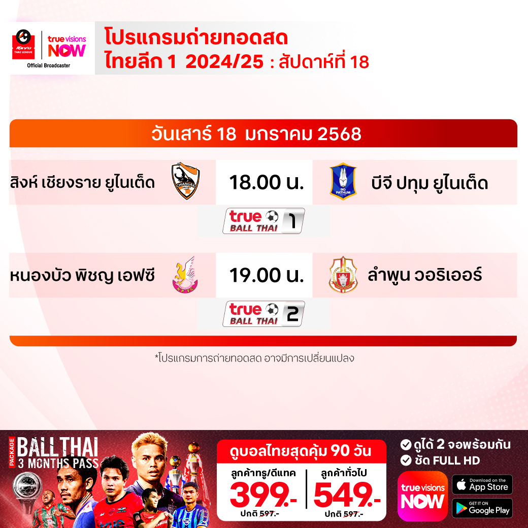 สิงห์ เชียงราย ยูไนเต็ด พบ บีจี ปทุม ยูไนเต็ด เวลา 18.00-20.00 ทางช่อง True Ball Thai 1