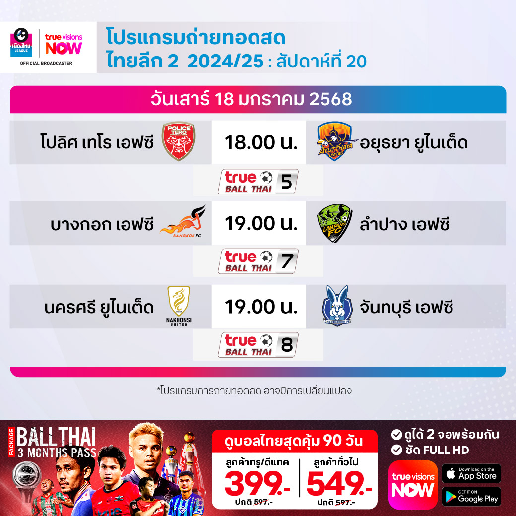โปลิศ เทโร เอฟซี พบ อยุธยา ยูไนเต็ด เวลา 18.00-20.00 ทางช่อง True Ball Thai 5