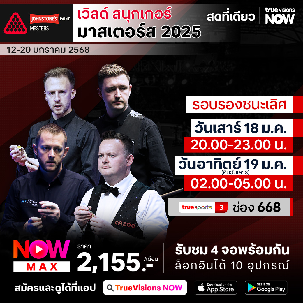 แฟนๆ สนุกเกอร์พลาดไม่ได้ กับการมาถึงของรายการ มาสเตอร์ส 1 ใน 3 ของรายการระดับ ทริปเปิ้ล คราวน์ ซีรี่ส์ กับรายการ จอห์นสโตนส์ เพนท์ มาสเตอร์ส ประเดิมศักราชใหม่ 2025 เตรียมพบกับนักสอยคิวมือพระกาฬระดับท็อป 16 ของโลก ร่วมชิงชัยในรายการแห่งศักดิ์ศรี ที่มันส์ทุกเฟรม ตื่นเต้นทุกแมตช์ ใครจะคว้าโทรฟี่แชมป์พร้อมกับเงินรางวัลกว่า 350,000 ปอนด์ ชมสด เอ็กซ์คลูซีฟ จาก อเล็กซานดร้า พาเลซ กรุงลอนดอน ที่เดียวที่ ทรูวิชั่นส์