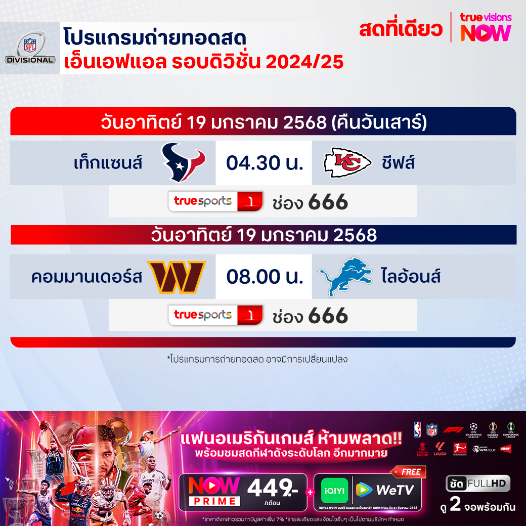 วันอาทิตย์ 19 ม.ค. Texans Vs Chiefs เวลา 04.30 ทางช่อง TS 1 (666)