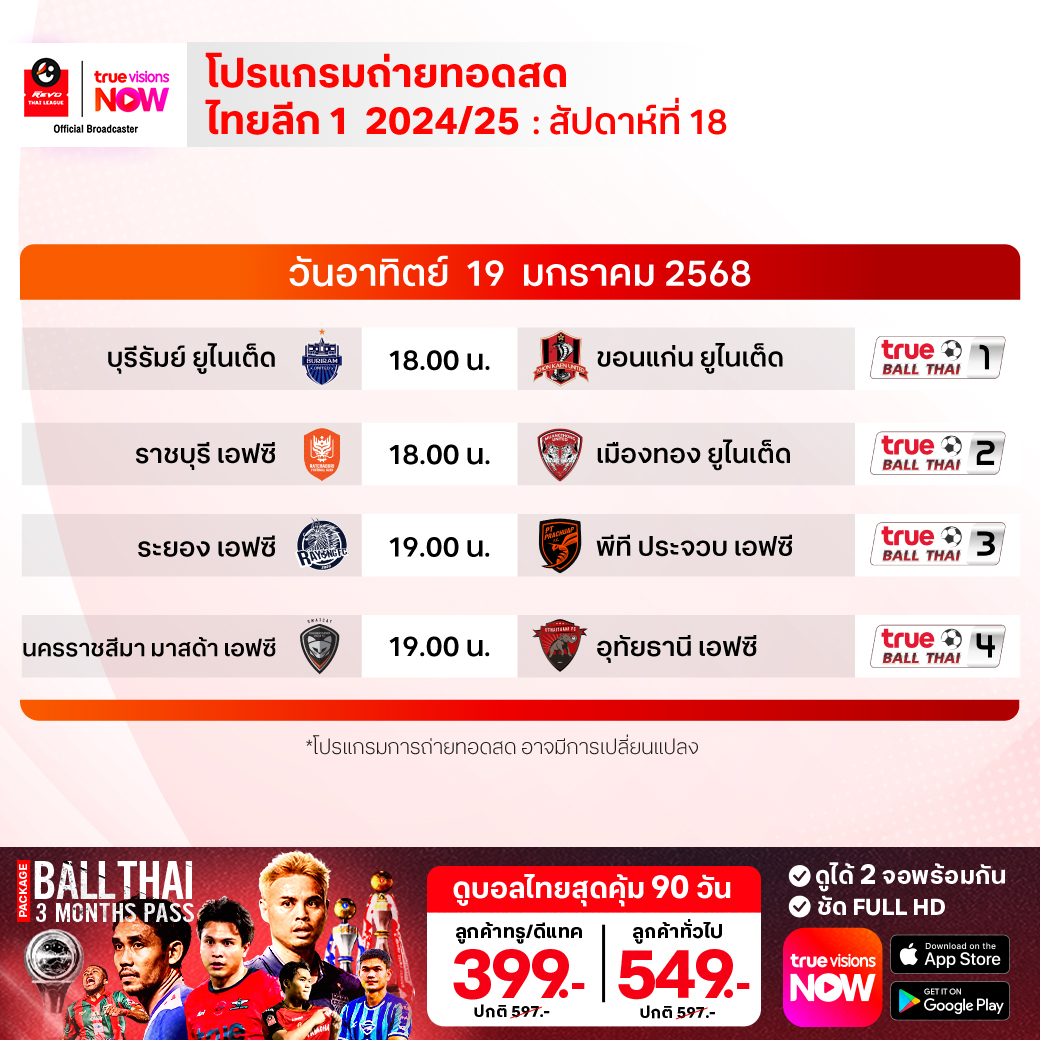นครราชสีมา มาสด้า เอฟซี พบ อุทัยธานี เอฟซี เวลา 19.00-21.00 ทางช่อง True Ball Thai 4
