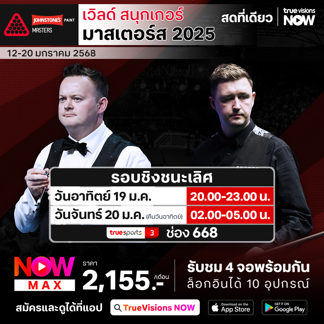 แฟนๆ สนุกเกอร์พลาดไม่ได้ กับการมาถึงของรายการ มาสเตอร์ส 1 ใน 3 ของรายการระดับ ทริปเปิ้ล คราวน์ ซีรี่ส์ กับรายการ จอห์นสโตนส์ เพนท์ มาสเตอร์ส ประเดิมศักราชใหม่ 2025 เตรียมพบกับนักสอยคิวมือพระกาฬระดับท็อป 16 ของโลก ร่วมชิงชัยในรายการแห่งศักดิ์ศรี ที่มันส์ทุกเฟรม ตื่นเต้นทุกแมตช์ ใครจะคว้าโทรฟี่แชมป์พร้อมกับเงินรางวัลกว่า 350,000 ปอนด์ ชมสด เอ็กซ์คลูซีฟ จาก อเล็กซานดร้า พาเลซ กรุงลอนดอน ที่เดียวที่ ทรูวิชั่นส์