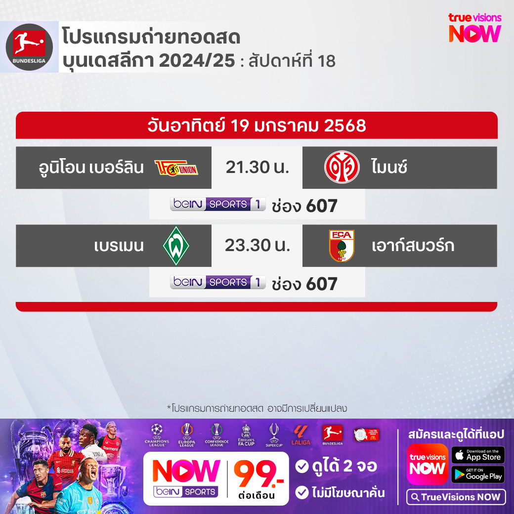 Werder Bremen vs Augsburg เวลา 23.30-01.30 ทางช่อง beIN 1 (607)
