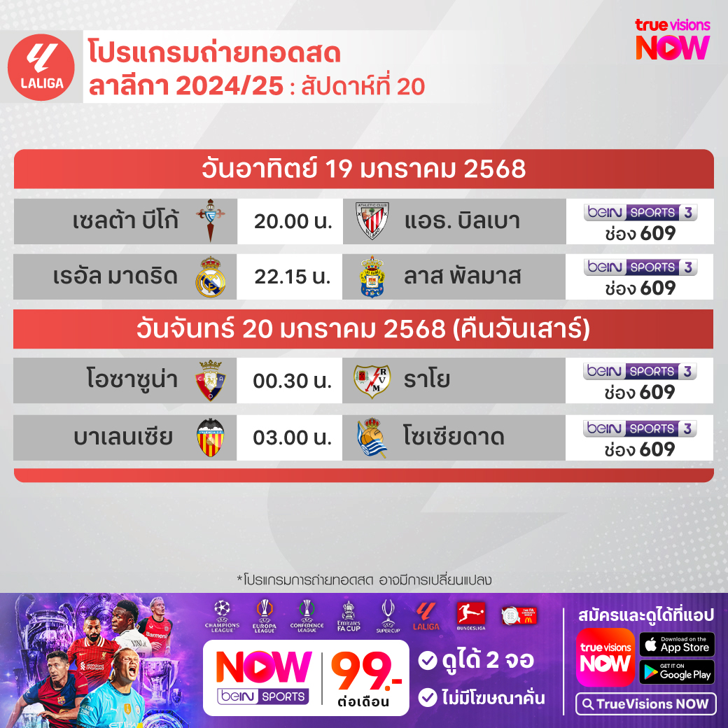 Valencia vs Real Sociedad เวลา) 03.00-05.00 ทางช่อง beIN 3 (609)